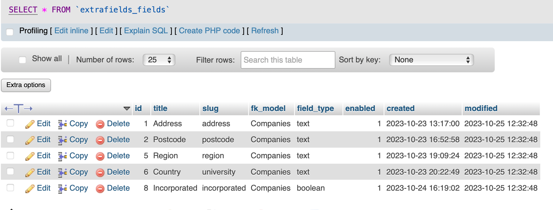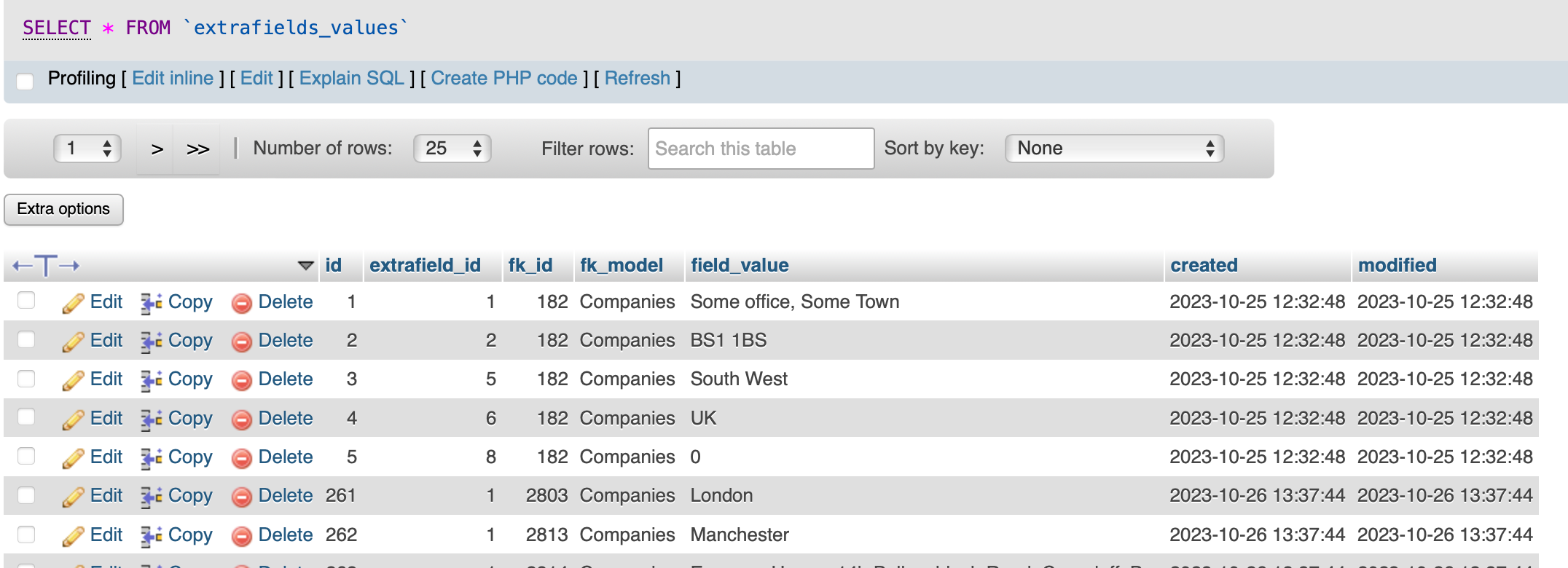 Note: the fk_model in extrafields_values is technically a duplicate field, and may be removed in the future, it’s there at present for testing purposes - use the fk_model in extrafields_fields for the joins