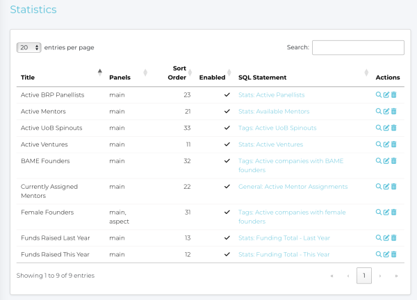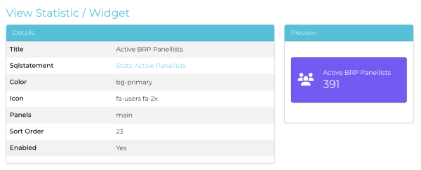 To make an SQL report available for use within a stats widget, the SQL Report boolean - 'Used in Stats' - must be True. The stat displayed is either the content of an SQL field called ’total’ or 'count' (case insensitive), if present, or a count of the returned records if not.