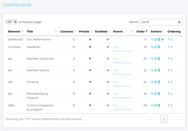 Here is a view of the Admin Items → Custom Dashboards table with a list of panels for the example dashboard ‘Our Performance’: